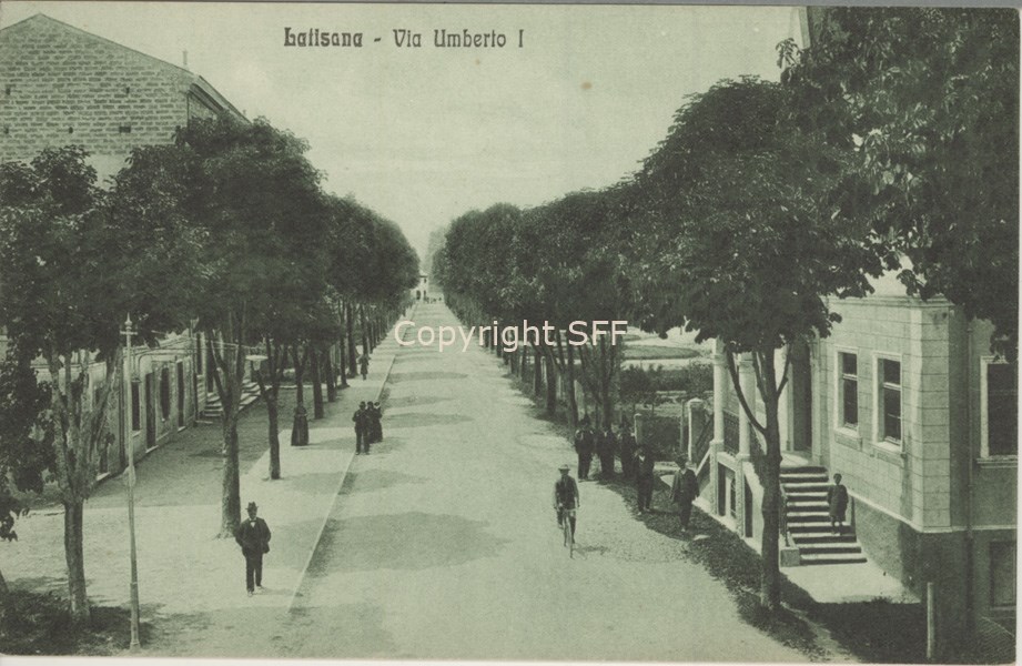 Abitazioni, alberi e qualche passante lungo via Umberto I