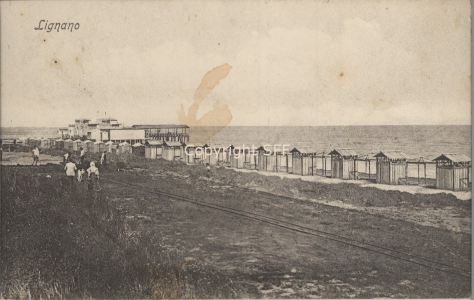 Spiaggia, alcune cabine e qualche persona in prossimità del mare