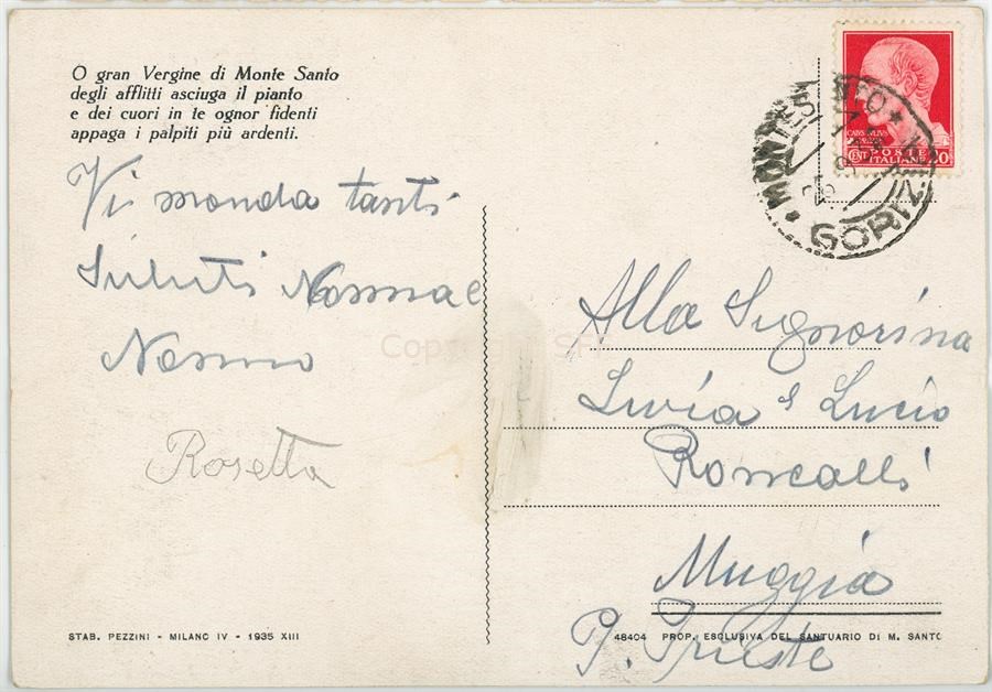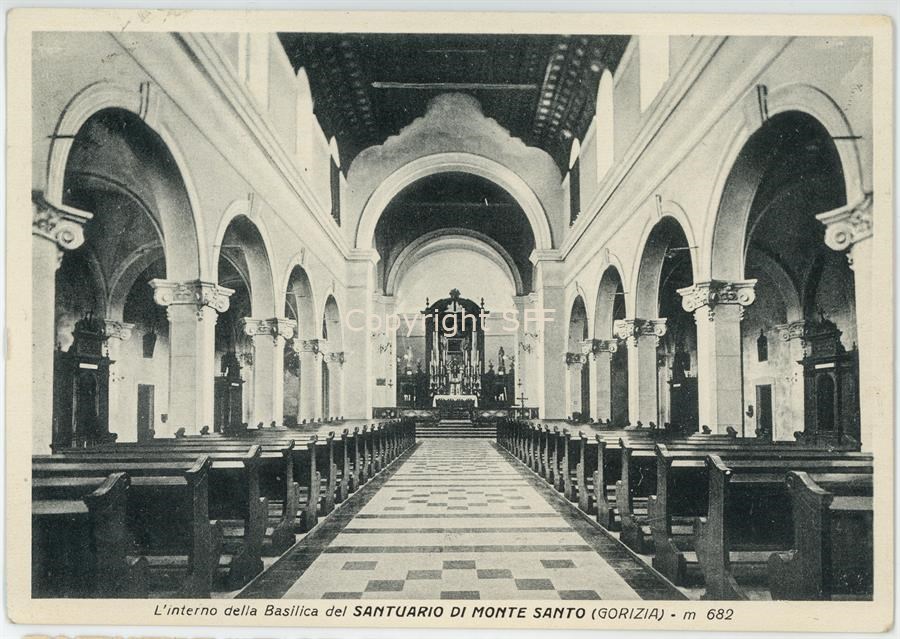Veduta dell'interno del Santuario di Monte Santo, ricostruito da ultimo nel 1928 dall'architetto Silvano Barich (1884-1958) dopo la distruzione dell'edificio preesistente nel 1915, durante i combattimenti della Grande Guerra.