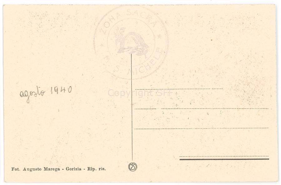 Veduta del Monumento ai Caduti Volontari Giuliani e Dalmati nella Grande Guerra sulla balconata di Cima 3 del Monte San Michele, datato 15 giugno 1932. Nel 1922 il Parlamento italiano aveva dichiarato il monte "Zona Sacra per fasti di gloria".