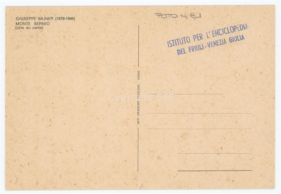 Il Monte Sernio (2187 m) è una montagna delle Alpi Carniche Orientali (Alpi Tolmezzine Orientali), è qui ritratto, con la tecnica ad olio, dal pittore Giuseppe Muner (1879-1949)