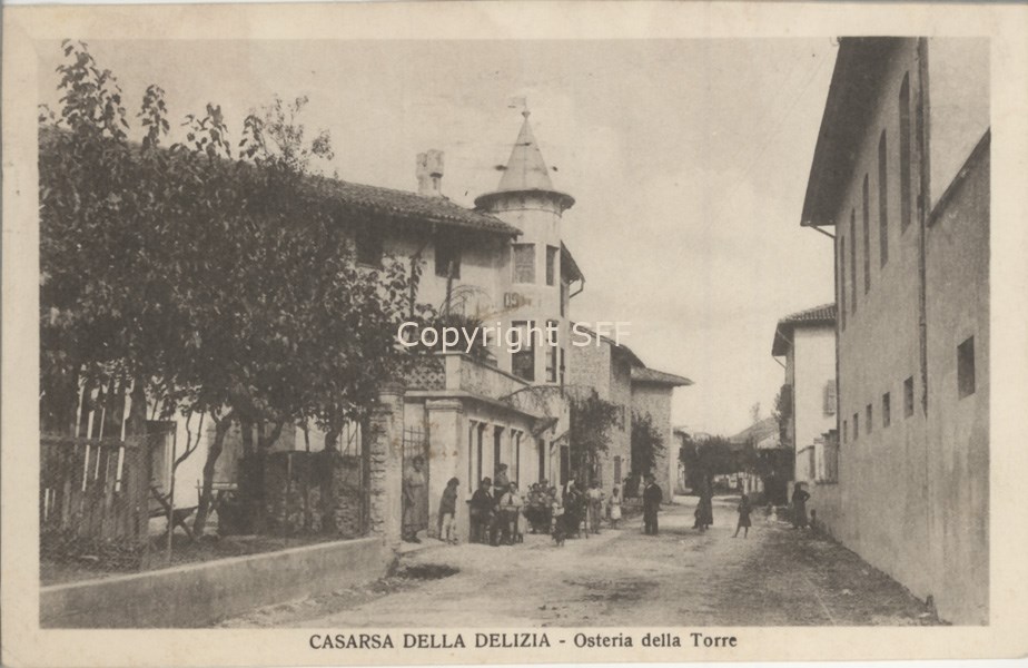 Sulla sinistra l'entrata dell'osteria della Torre con alcuni avventori