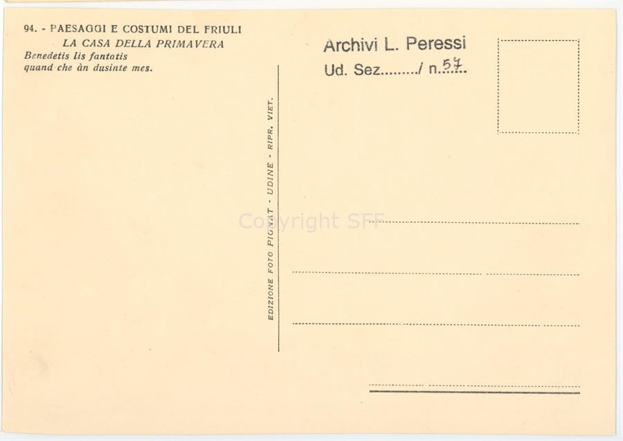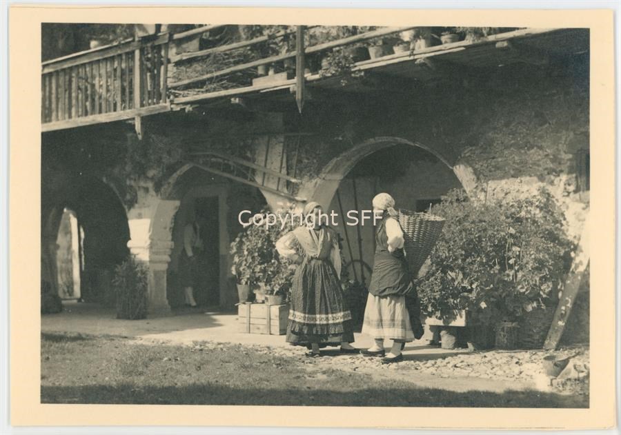 Ritratto di due donne in costumi tradizionali carnici riprese in una corte. Una delle due porta sulle spalle la gerla. Documentazione del patrimonio etnoantropologico