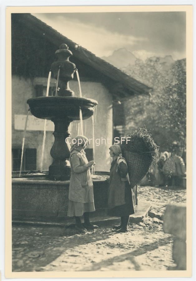 Ritratto di gruppo in esterno. Due donne in costumi tradizionali carnici, mentre chiacchierano vicino alla fontana in Borgo Vico a Forni di Sotto. Una delle quali porta la gerla piena di fieno sulle spalle. Documentazione del patrimonio etnoantropologico