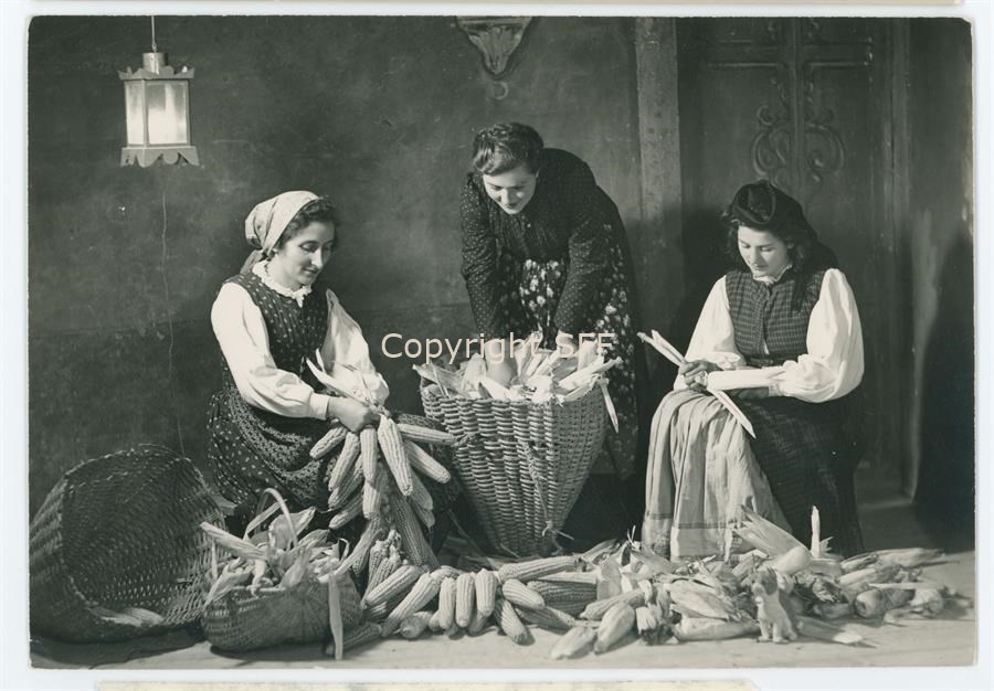Ritratto di un gruppo di donne in costumi tradizionali carnici riprese in un ambiente domestico mentre sono impegnate nella scartocciatura della pannocchie di mais. Al centro una gerla ricolma. Documentazione del patrimonio etnoantropologico
