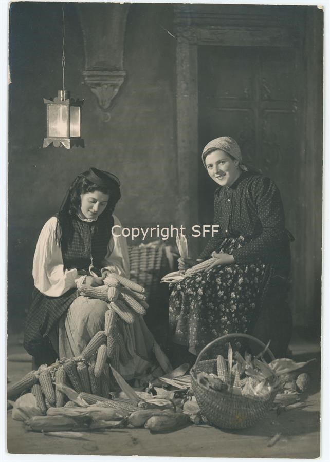 Ritratto di due donne in costumi tradizionali carnici riprese in un ambiente domestico mentre sono impegnate nella scartocciatura della pannocchie di mais. Al centro una gerla ricolma. Documentazione del patrimonio etnoantropologico