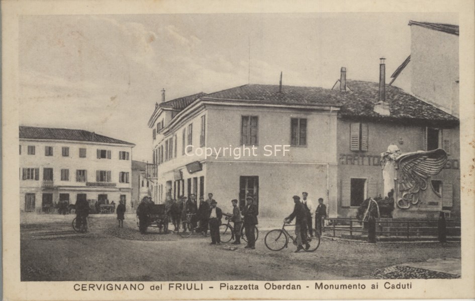 Piazzetta Oberdan; sulla destra il monumento ai Caduti. Presenti in piazza alcuni abitanti