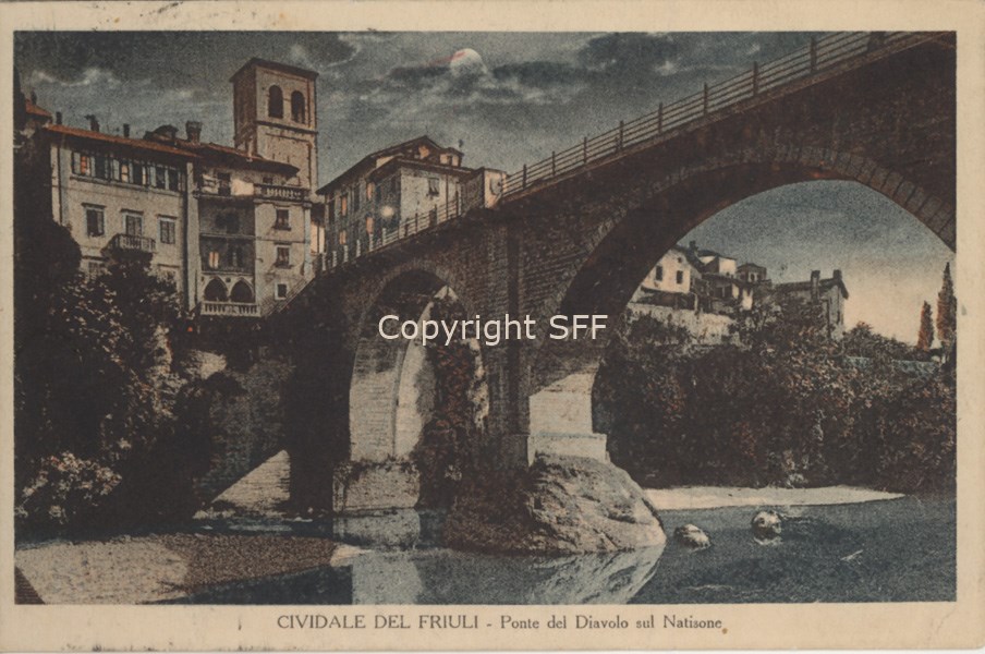 Ponte del Diavolo sul fiume Natisone; in alto sullo sfondo si vedono alcuni edifici civile della cittadina