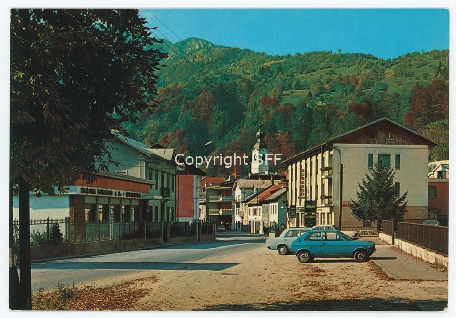 Vista sull'abitato di Pontebba attraverso via Mazzini. La località si trova compresa tra il Canal del Ferro, al confine a est con la Val Canale, in una zona di confine tra Alpi Carniche e Alpi Giulie con il confine tra l'Austria e l'Italia