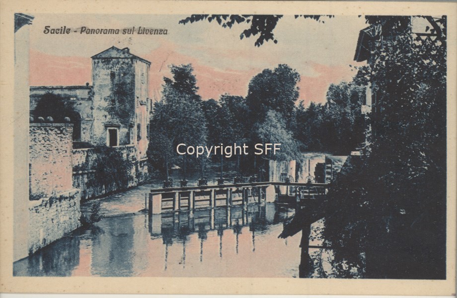 Veduta di alcune costruzioni e di una chiusa sul fiume Livenza