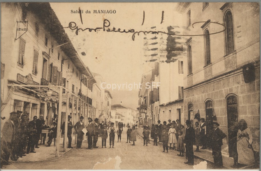 Attività commerciali, abitazioni e passanti lungo una strada di Maniago