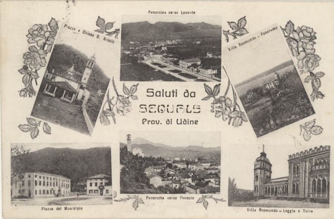 Saluti da Sequals Piazza e Chiesa S. Nicolò - Panorama verso levante - Villa Rosmunda _ Panorama - Piazza del Municipio - Panorama verso ponente - Villa Rosmunda - Loggia e Torre