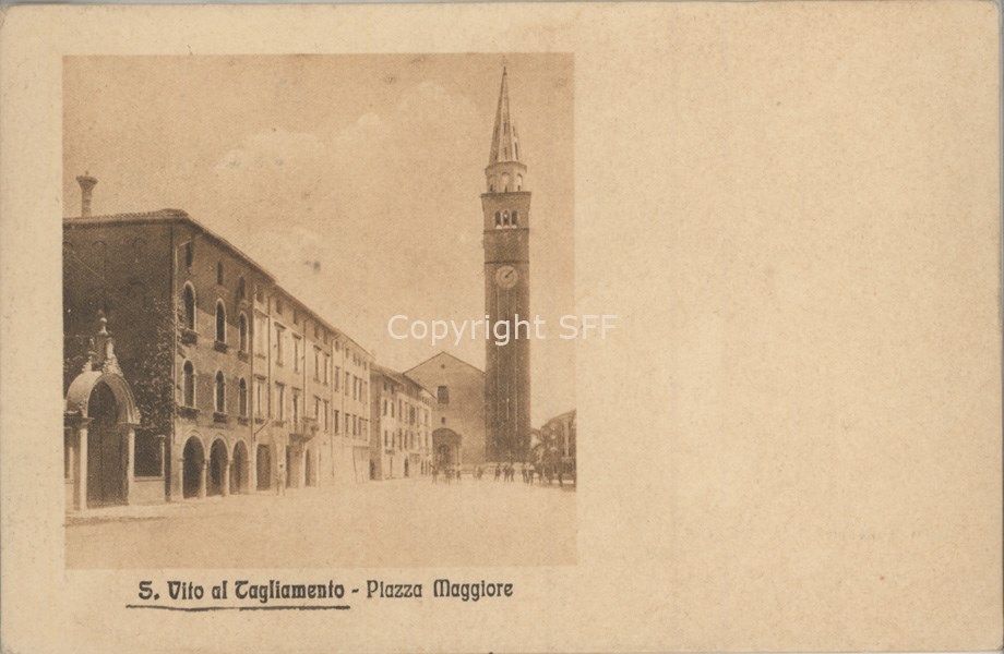 Attvità commerciali, abitazioni e sullo sfondo il duomo e il campanile nella piazza di San Vito al Tagliamento