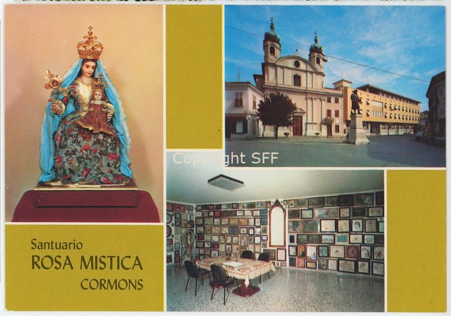 Vista su Piazza Libertà di Cormons con la statua bronzea raffigurante l’Imperatore Massimiliano I d’Asburgo (1903), rimossa dopo la prima guerra mondiale, è stata ricollocata qui nel 1981. La facciata della chiesa di Santa Caterina, nota anche come Santuario di Rosa Mistica. Questo nome è dovuto ad una piccola statua prodigiosa di Maria, incastonata come pietra preziosa nel grande altare policromo della chiesa e riprodotta. A sinistra l'immagine devozionale della Madonna Rosa Mistica. Interno si una sala con ex voto alle pareti.