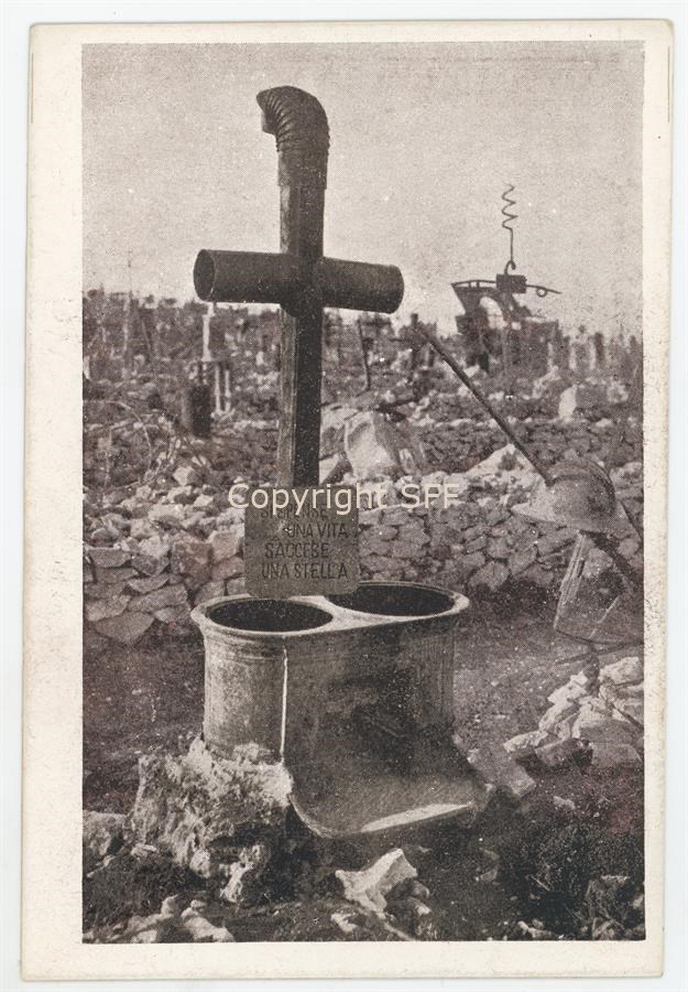 Veduta di una sepoltura nel Cimitero degli Invitti della III Armata sul Colle Sant'Elia a Redipuglia, il primo sacrario monumentale della Grande Guerra, ideato nel 1919 dall'Ufficio militare per i Caduti di Guerra e inaugurato nel 1923. Dopo il 1938, con la traslazione delle salme nel nuovo Sacrario antistante, il sito venne trasformato in Parco della Rimembranza.