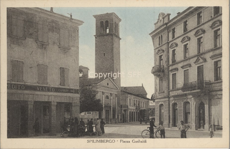Attività commerciali (Credito Veneto), abitazioni e sullo sfondo la chiesa di San Giovanni dei Battuti (1346 circa) con adiacente campanile (1487) in piazza Garibaldi