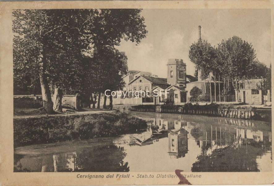 Sullo sfondo il complesso industriale delle Distillerie Italiane; in primo piano il canale d'acqua adiacente lo stabilimento