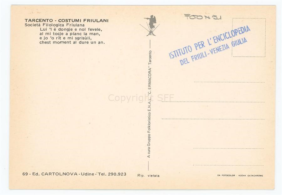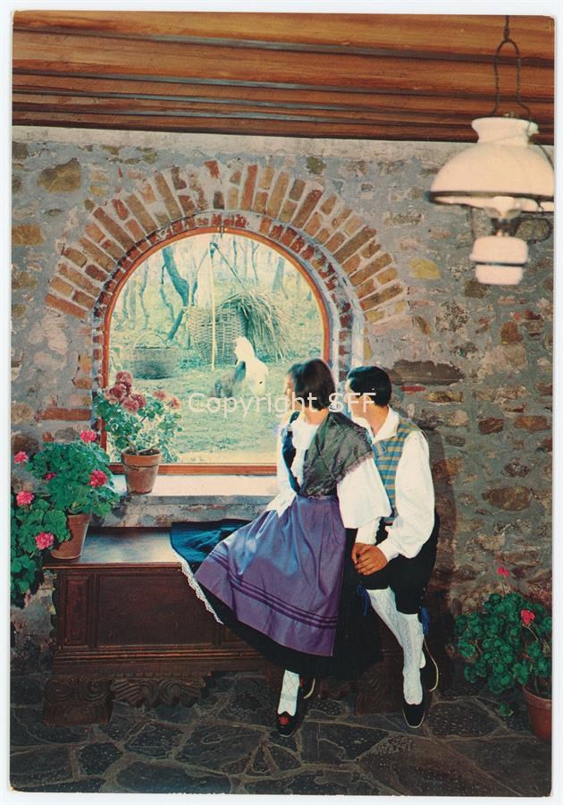 Ritratto in interno di una donna e un uomo in costume friulano, in posa davanti ad una finestra aperta sul giardino