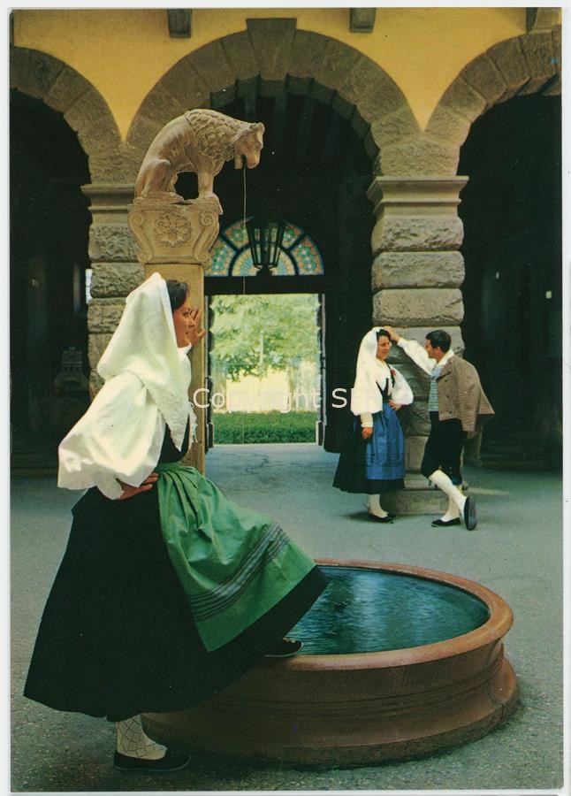 Ritratto di una giovane donna ripresa in una corte interna di un palazzo a Tarcento accanto ad una fontana. Sullo sfondo una coppia di giovani anch'essi in costumi tradizionali carnici. Documentazione del patrimonio etnoantropologico.