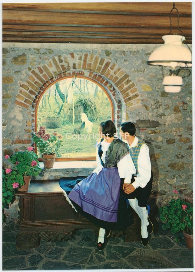 Ritratto in interno una giovane coppia in costumi tradizionali carnici, ripresi mentre seduti guardano oltre la finestra. Documentazione del patrimonio etnoantropologico