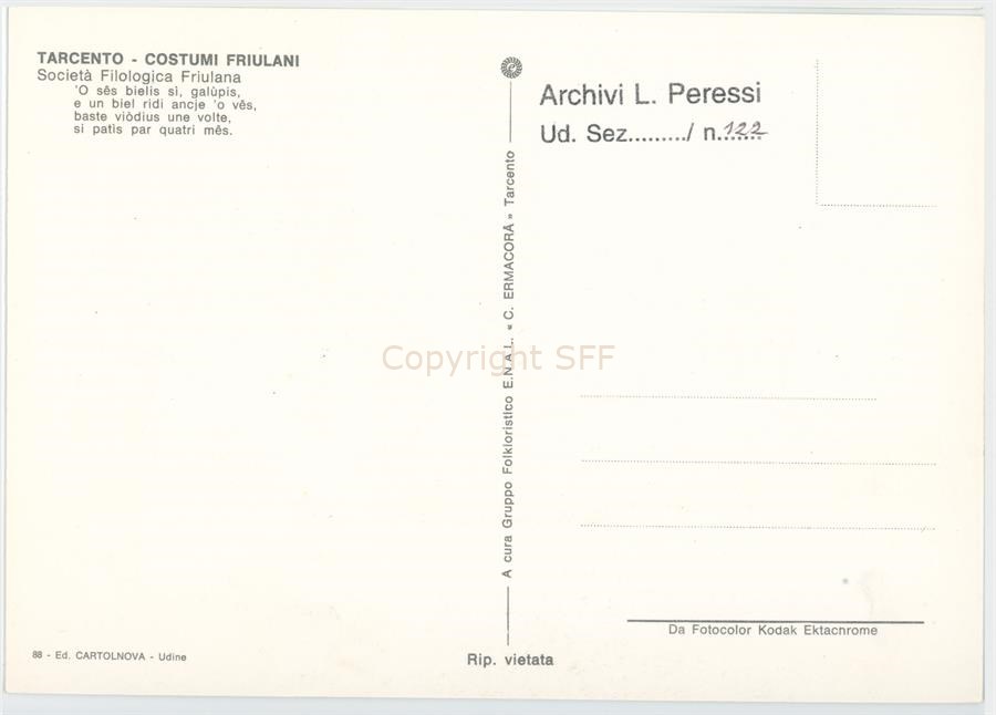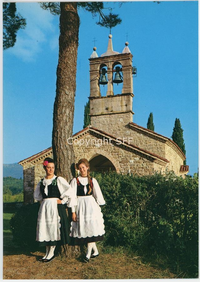 Ritratto di due giovani donne in costumi tradizionali carnici riprese accanto ad un albero , sullo sfondo la facciata della chiesetta dedicata a Sant’Eufemia, nella frazione di Segnacco di Tarcento. Documentazione del patrimonio etnoantropologico