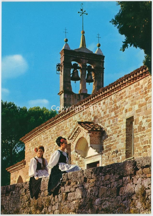 Ritratto di due giovani donne in costumi tradizionali carnici sedute lungo il muro di cinta della chiesetta dedicata a Sant’Eufemia nella frazione di Segnacco di Tarcento. Documentazione del patrimonio etnoantropologico