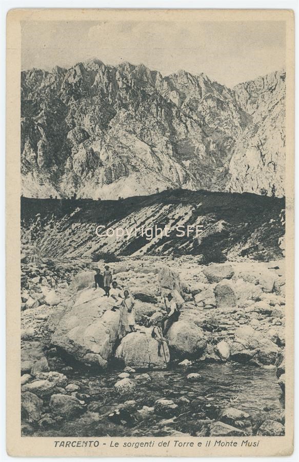 Cartolina viaggiata. Un gruppo di escursionisti sul greto del torrente Torre, ai piedi della piana nella catena prealpina dei Musi.