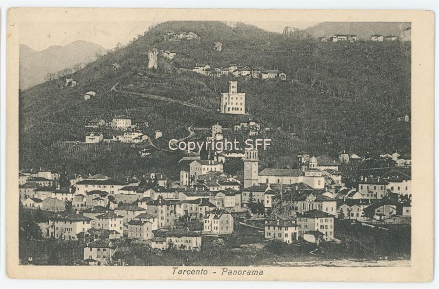 Cartolina viaggiata. Vista panoramica su Tarcento. Veduta della città e del duomo di San Pietro apostolo. Sul colle i resti di un torrione del castello alto-medievale di Coia, oggi anche conosciuto come “Castellaccio” o “Cjscjelàt” in friulano.