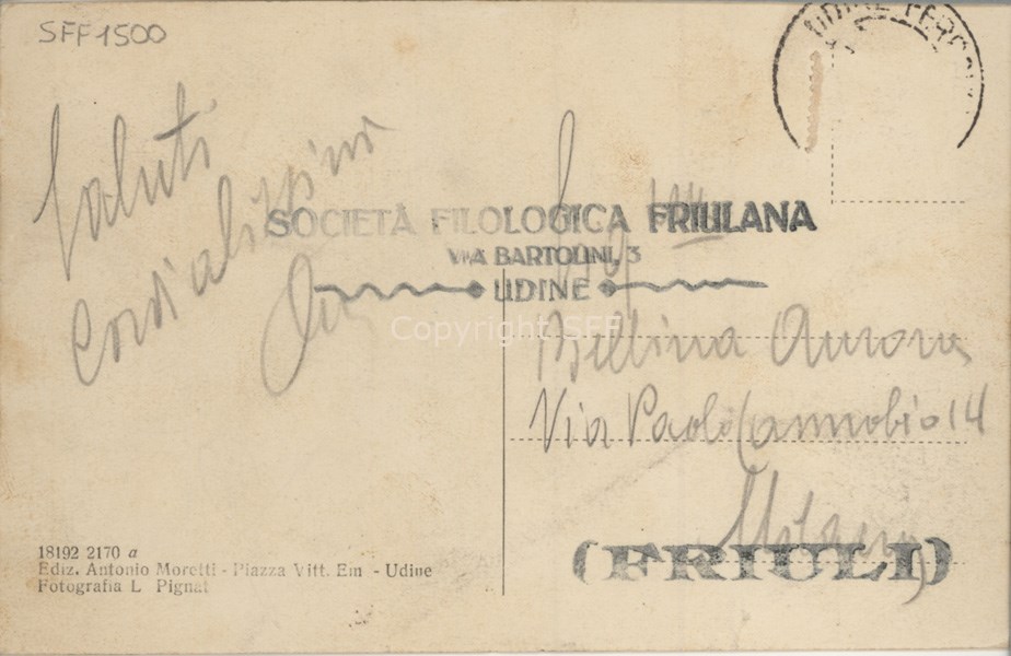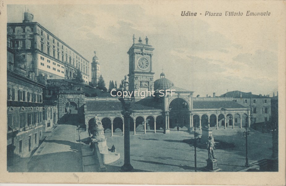 Piazza Libertà (già piazza Vittorio Emanuele) con la loggia di San Giovanni, la torre dell'orologio, sulla sinistra uno scorcio della loggia del Lionello e sullo sfondo il castello e il campanile dello stesso