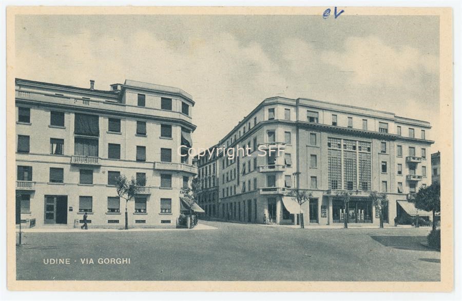 Vista su via Gorghi a d Udine. A destra il Palazzo Teatro Cinema Odeon progettato da Ettore Gilberti e inaugurato nel 1936.