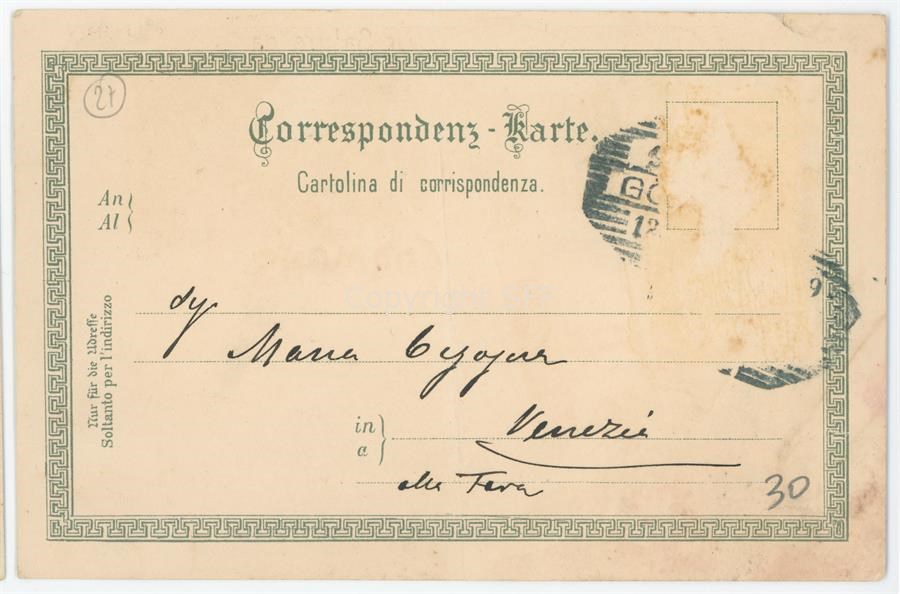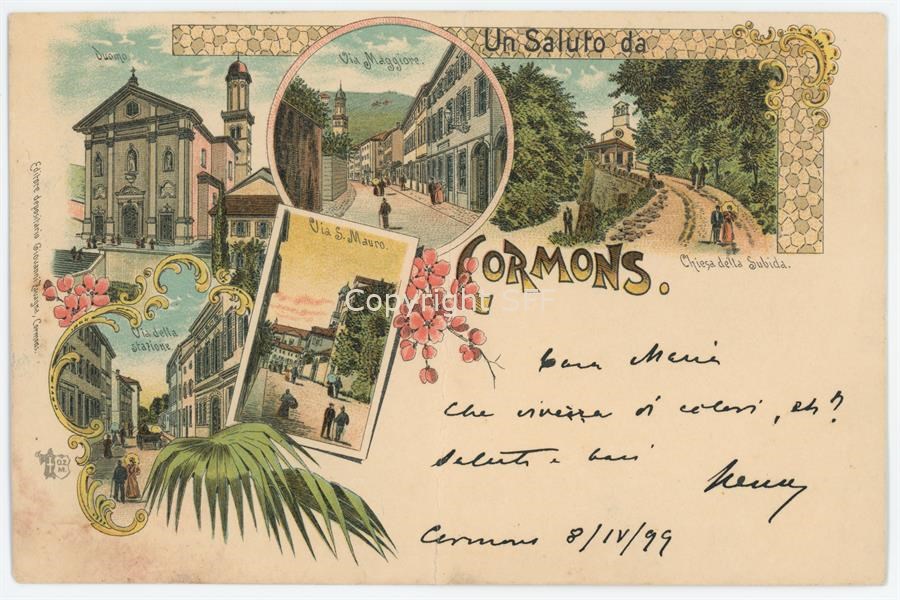 Cartolina viaggiata con multiple riproduzioni a colori di Cormons: Duomo; via della Stazione; via Maggiore, via S. Mauro Chiesa della Subida