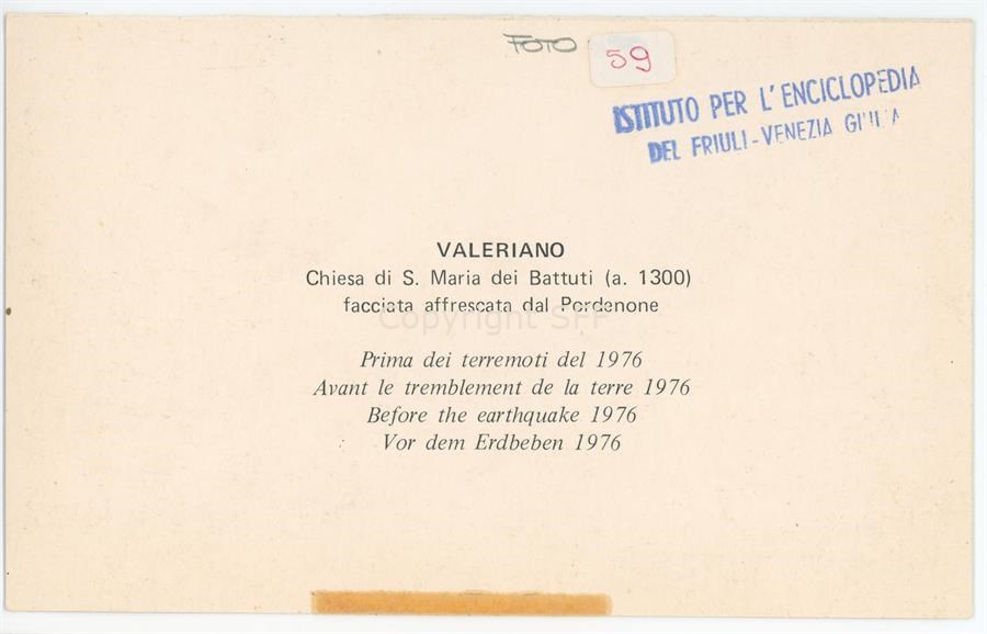 Panorama sull'abitato di Valeriano, frazione di Pinzano al Tagliamento. In primo piano la chiesa di Santa Maria dei Battuti ripreso prima dei terremoti del 1976. Il piccolo edificio di culto è stato eretto dalla confraternita dei Battuti di Valeriano attorno al 1300. La facciata si adorna del portale lapideo scolpito da Giovanni Antonio Pilacorte, sull’archivolto la data: «1499 adì 15 de mazo» (maggio). Sulla facciata il Pordenone affrescò, nel 1524, sul lato destro il possente S. Cristoforo, sul lato sinistro in alto la Fuga in Egitto e sul riquadro inferiore le figure dei santi Giovanni Battista, Stefano e Valeriano; sopra il portale un’Incoronazione della Vergine. Tutti gli affreschi originari della facciata, risalenti al 1524, sono custoditi all'interno della chiesa, sulla controfacciata, per ripararli dalle intemperie, mentre esteriormente sono state riprodotte delle tracce monocromatiche.