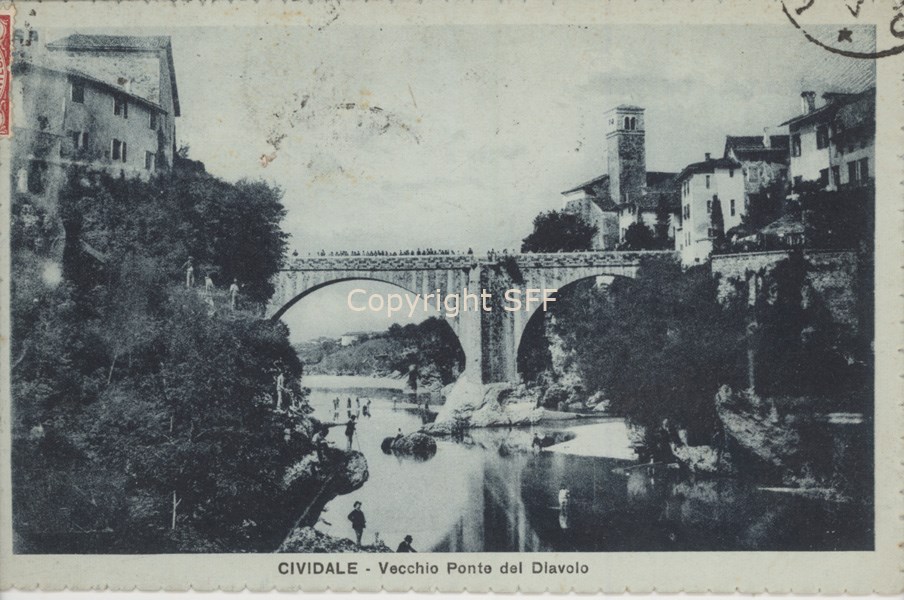Il ponte del Diavolo e alcuni edifici sulla riva del fiume Natisone