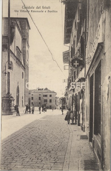 Edifici che si affacciano su via Vittorio Emanuele III; sulla sinistra si vede il Duomo di Cividale