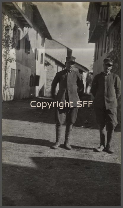 Il soldato Zoccolan e il Capitano Sandron ritratti tra le vie dell'abitato di Capriva, anche se nelle didascalie la località è segnalata come S. Lorenzo di Mossa. A Capriva nell’ottobre del 1915 la 7^ Batteria someggiata stabilì la sede del proprio comando.