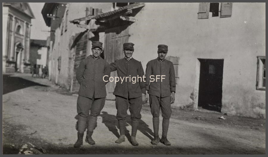 Il soldato Zoccolan, Radice e il Capitano Sandron ritratti tra le vie dell'abitato di Capriva, anche se nelle didascalie la località è segnalata come S. Lorenzo di Mossa. A Capriva nell’ottobre del 1915 la 7^ Batteria someggiata stabilì la sede del proprio comando.