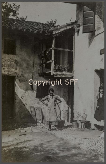 Ritratto di Amalia e Marcellina nel cortile a Sant'Andrà. Scatti di vita quotidiano nelle retrovie. La 7ª Batteria nel settembre del 1915 si trasferisce in località San Andrat del Judrio (oggi in comune di Corno di Rosazzo), in accampamenti allestiti con tende lungo le rive del torrente. Marcellina morì di parto qualche mese dopo la permanenza della Batteria