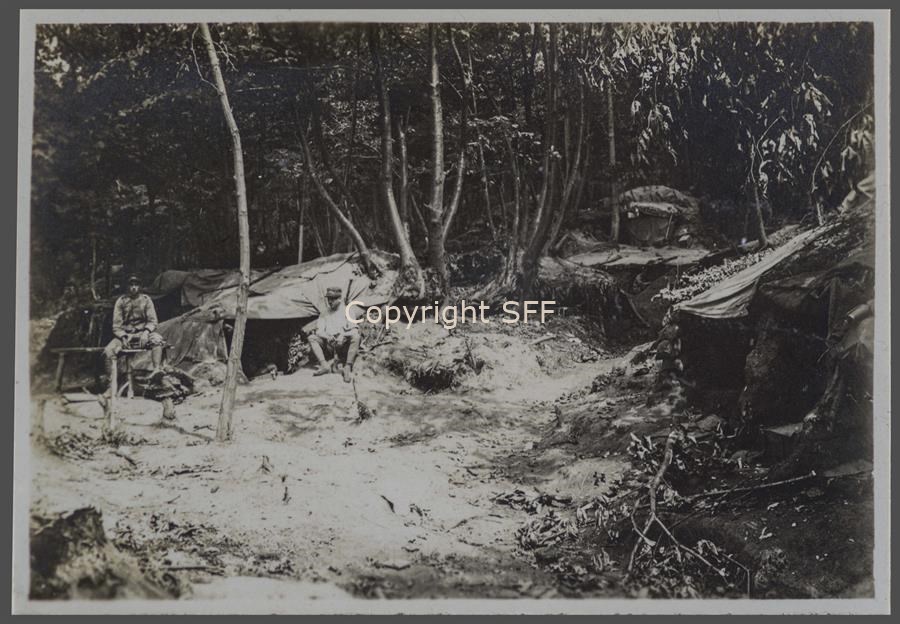 Soldati della 7ª Batteria Someggiata, tra cui il Cap. Maggiore Trinchieri, ritratti nei pressi dei ricoveri dove stanziano sul Monte Calvario [Podgora] nell'estate del 1915