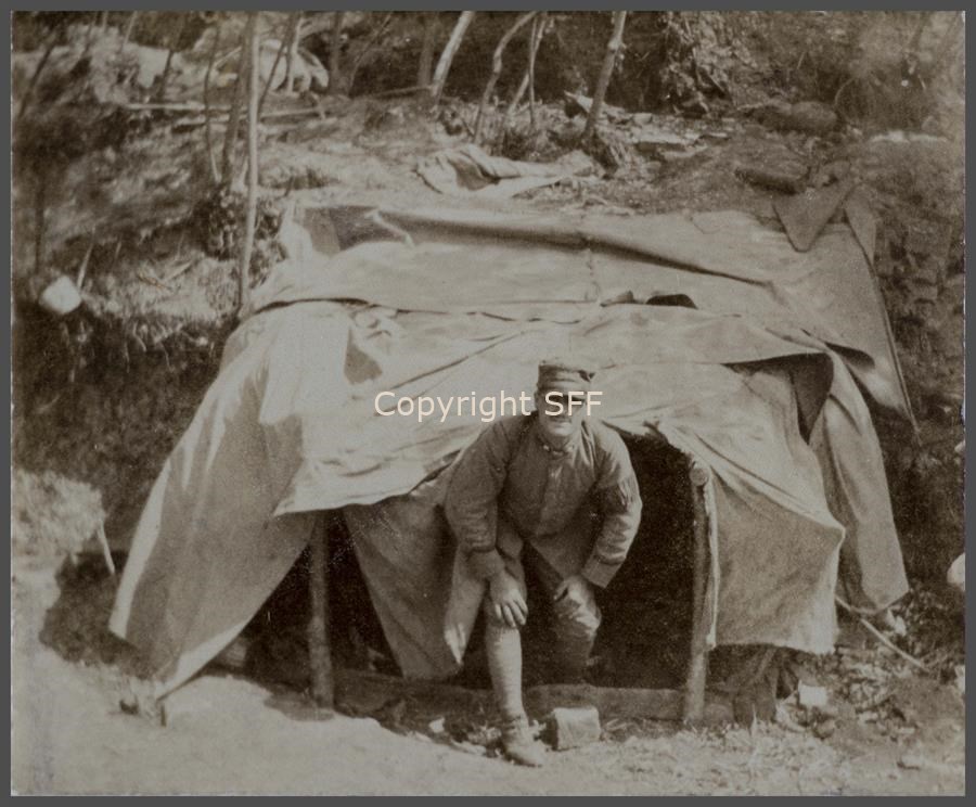 Ritratto del Caporale Cannella all'esterno del ricovero sul Monte Calvario [Podgora] nell'estate del 1915. Accampamento militare della 7ª Batteria Someggiata