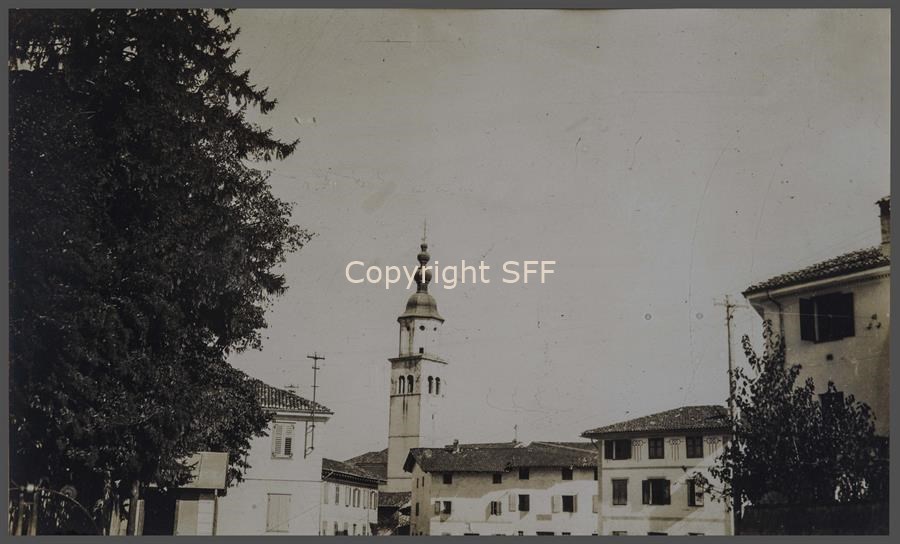 La piazza del paese di Capriva dove nell’ottobre del 1915 la 7^ Batteria someggiata stabilì la sede del proprio comando. Nella casa più a destra aveva sede la mensa dell'ospedaletto dove furono aggregati