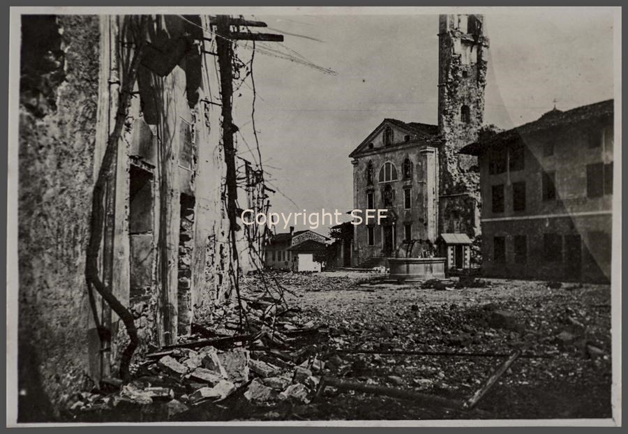 La chiesa di Lucinico ripresa nel luglio del 1915 con accanto il campanile bombardato. L’antica torre campanaria venne fatta brillare all’alba del 24 maggio del 1915 dai genieri austro ungarici. Si nota ai piedi del basamento del campanile la garitta della pesa pubblica.