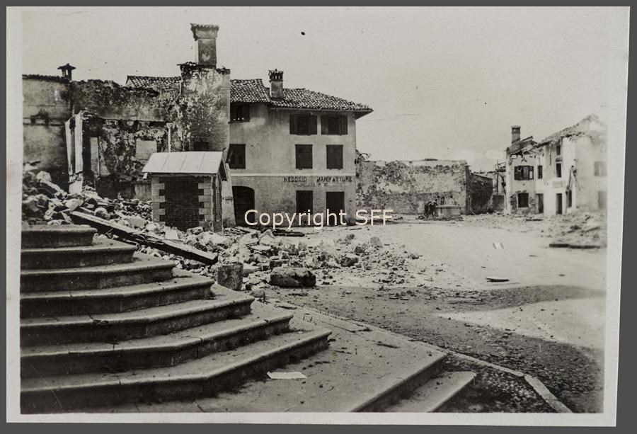 Abitato di Lucinico bombardato ripreso della gradinata della chiesa. Lo scatto, eseguito nel luglio del 1915, riprende accanto alle macerie del campanile bombardato la garitta della pesa pubblica.