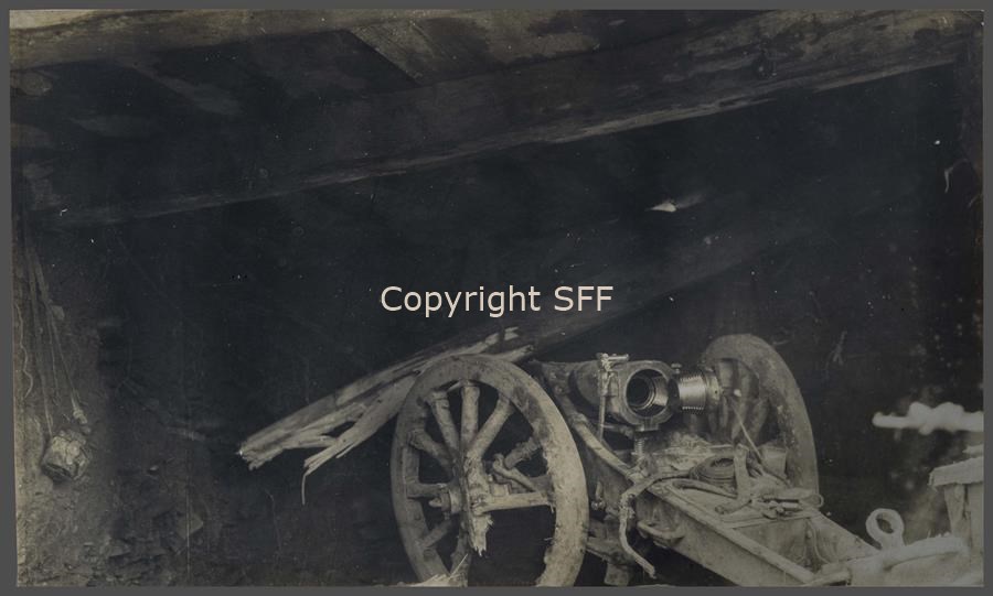 Danni alla postazione colpita da una granata e al cannone da 70 lì custodito. Il riparo, sul Monte Calvario [Podgora] , serviva spesso come dormitorio dei soldati.