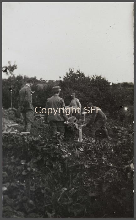 Sepoltura dei caduti del 12° fanteria nei pressi del Monte Calvario [Podgora] durante l'estate del 1915. Poco tempo dopo a cura del comando di quel Reggimento il terreno fu sistemato a camposanto. In esso giacquero cinque soldati della nostra batteria (7ª Batteria Someggiata)