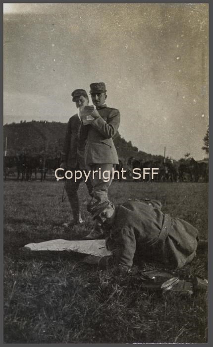 Scatti di vita quotidiano nelle retrovie. Un gruppo di sergenti ripresi mentre studiano per l'esame da ufficiale. La 7ª Batteria nel settembre del 1915 si trasferisce in località San Andrat del Judrio (oggi in comune di Corno di Rosazzo), in accampamenti allestiti con tende lungo le rive del torrente Iudrio.