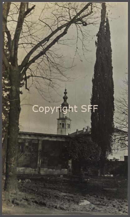Il campanile del paese di Capriva ripreso dal giardino delle suore dove una Madonnina in grotta veniva omaggiata di candele e a cui i soldati rivolgevano le proprie preghiere prima dei combattimenti. Nell’ottobre del 1915 la 7^ Batteria someggiata stabilì la sede del proprio comando a Capriva.