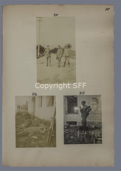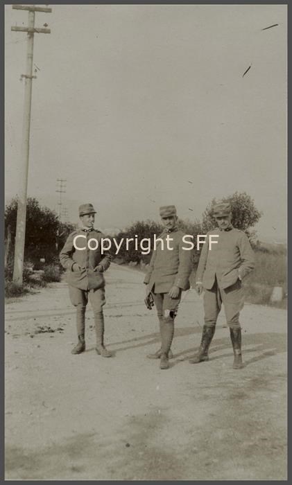 Il Capitano Oreste Bugni, con binocolo, assieme a due ufficiali lungo una strada.