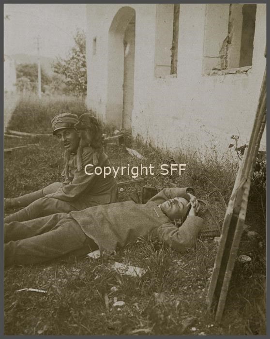 Il Capitano Oreste Bugni assieme al S. Tenente XXX mentre riposano nei pressi dei un edificio.