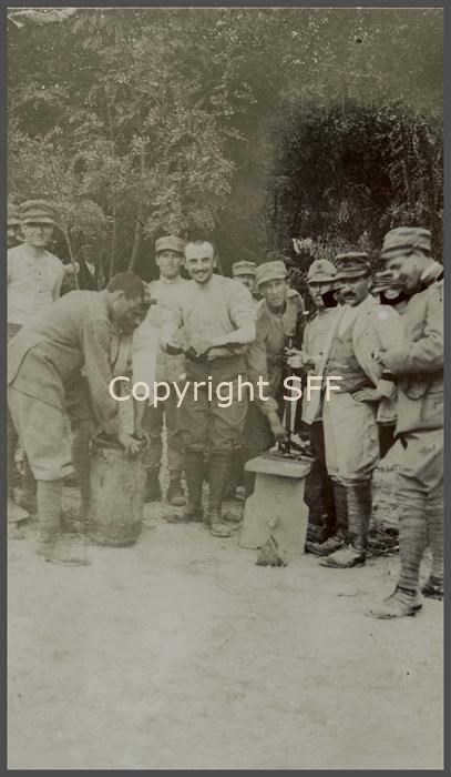 Il Capitano Bugni assieme ad altri soldati ritratti in un accampamento di retrovia mentre preparano un composto
