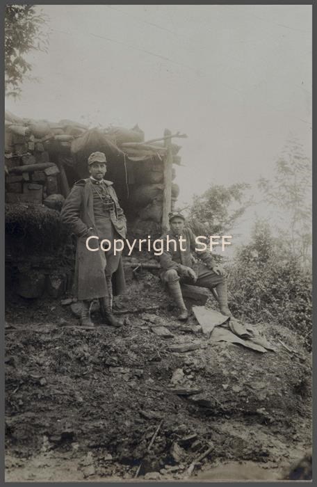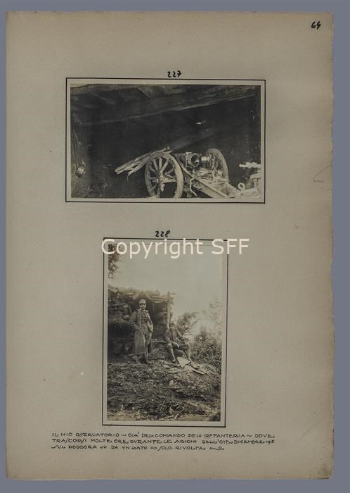 Un ufficiale e il soldato Rivolta ripresi all'esterno dell'osservatorio, ricovero già del 12° fanteria, utilizzato durante le azioni tra l'ottobre e il dicembre 1915 sul Monte Calvario [Podgora].